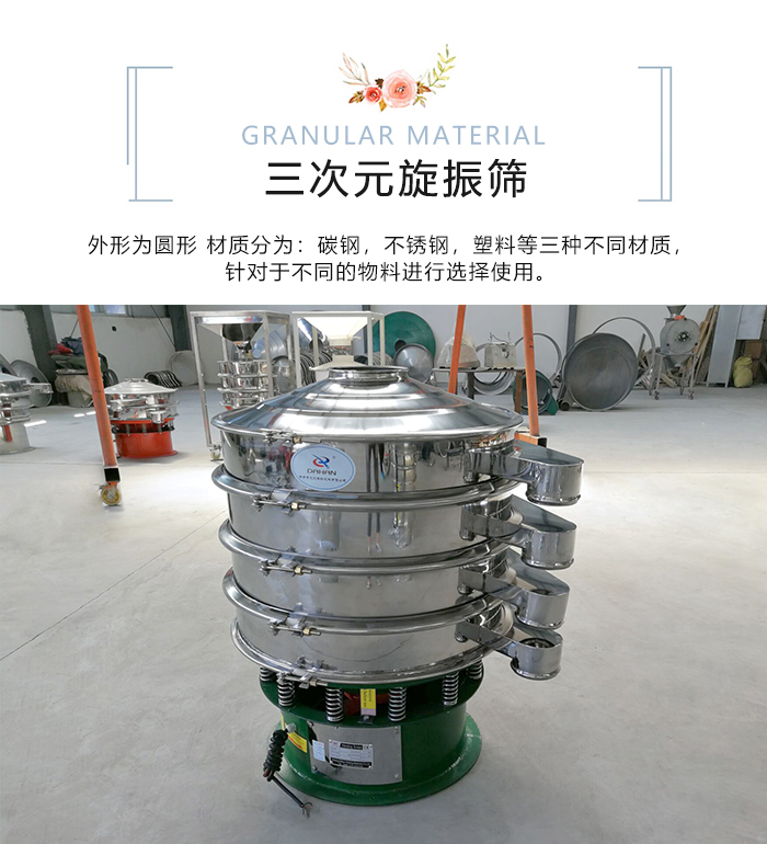 三次元旋振篩又稱旋振篩/三次元振動篩,是一種比較常見的篩分設備,外形為圓形,材質分為:碳鋼,不銹鋼,塑料等三種不同材質,針對于不同的物料進行選擇使用。