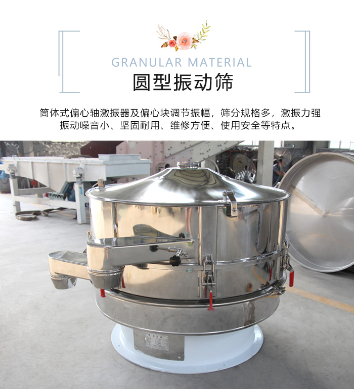 圓型振動篩是一種做圓形振動,多層數(shù)的新型振動篩。圓型振動篩采用筒體式偏心軸激振器及偏心塊調(diào)節(jié)振幅,物料篩淌線長,篩分規(guī)格多,具有結(jié)構(gòu)可靠、激振力強(qiáng)、篩分效率高、振動噪音小、堅固耐用、維修方便、使用安全等特點。