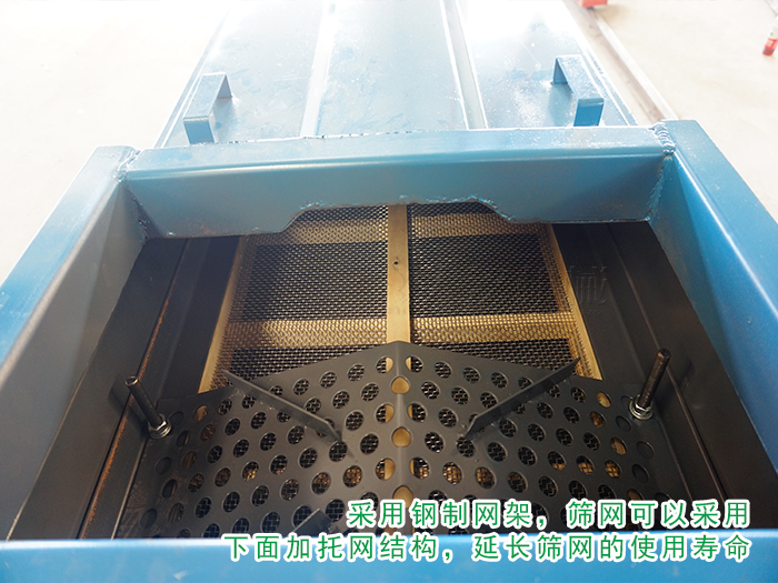 顆粒石英砂篩分要求產量較大,且物料的磨琢性較大,直線振動篩采用鋼制網架,篩網可以采用下面加托網結構,延長篩網的使用壽命,網架采用分段網架,實現(xiàn)哪段篩網磨損更換哪段篩網的效果。
